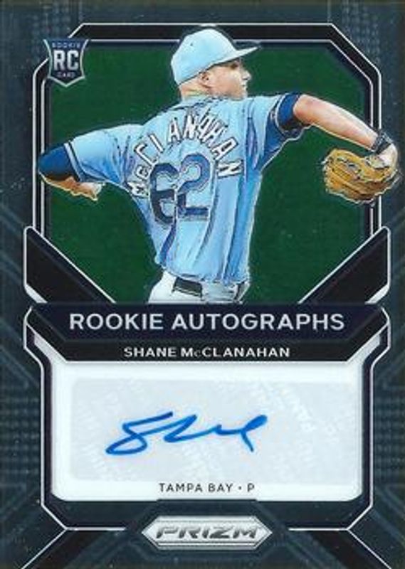 The Shane McClanahan 2021 Prizm #RA-SM Rookie Autographs card is 1 of 70 Shane McClanahan's card variations in the 2021 Prizm set being tracked by Sports Card Investor, including Base, Blue, Blue Velocity, Carolina Blue, and Cosmic Haze.