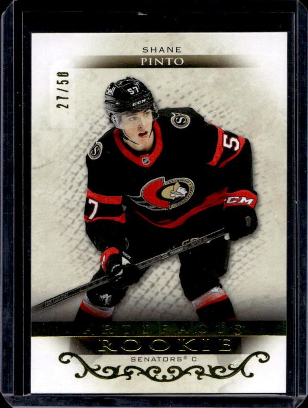The Shane Pinto 2021 Upper Deck Artifacts #176 Yellow /50 Rookie card is 1 of 21 Shane Pinto's card variations in the 2021 Upper Deck Artifacts set being tracked by Sports Card Investor, including Base /999, Neon Green, Rose Gold, Turquoise, and Ruby /499.