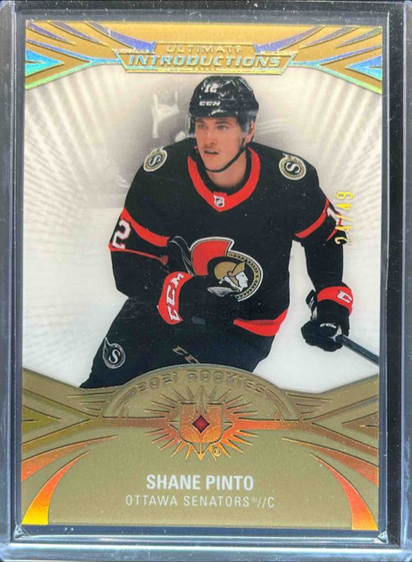 The Shane Pinto 2021 Upper Deck Ultimate Collection #UI-67 Ultimate Introductions Rookie card is 1 of 28 Shane Pinto's card variations in the 2021 Upper Deck Ultimate Collection set being tracked by Sports Card Investor, including Base /299, 2000 Ultimate Signatures Retro, 2000 Ultimate Signatures Retro Rookies, Signatures Masterpieces, and Ultimate Emblems - Auto.