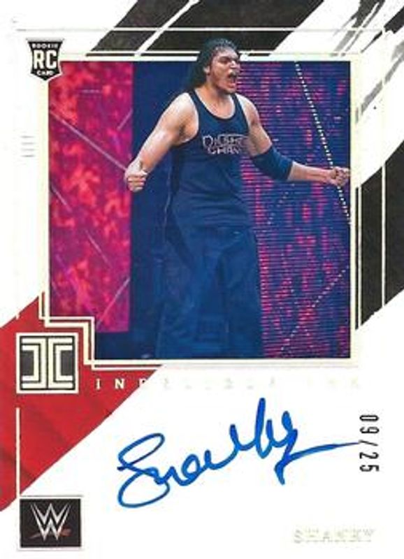 The Shanky 2022 Impeccable WWE #IN-SHY Indelible Ink - Holo Silver /25 Rookie card is 1 of 10 Shanky's card variations in the 2022 Impeccable WWE set being tracked by Sports Card Investor, including Base /99, Silver /49, Gold /35, Holo Silver /25, and Holo Gold /10.