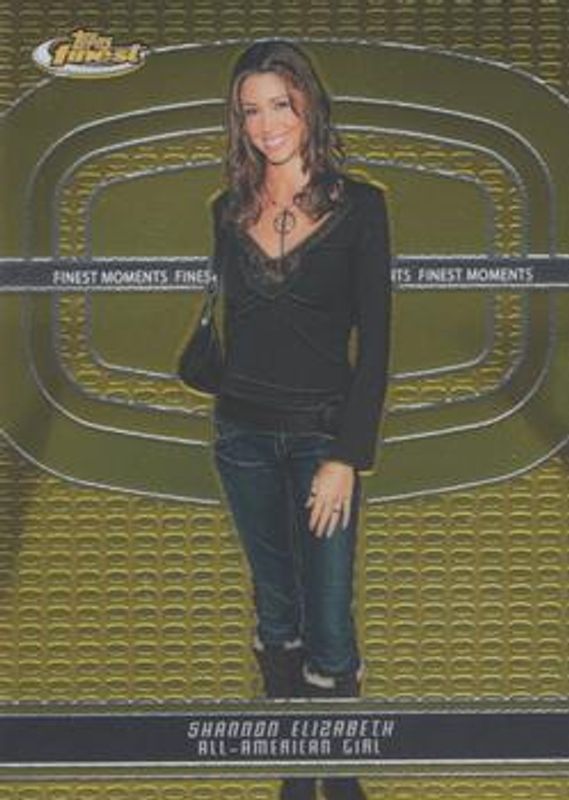 The Shannon Elizabeth 2005 Topps Finest #SE1 Boxloaders Celebrity Moments /399 Rookie card is 1 of 33 Shannon Elizabeth's card variations in the 2005 Topps Finest set being tracked by Sports Card Investor, including Base /599, Refractor /249, X Fractors /199, Refractor Red /169, and X Fractors Red /139.