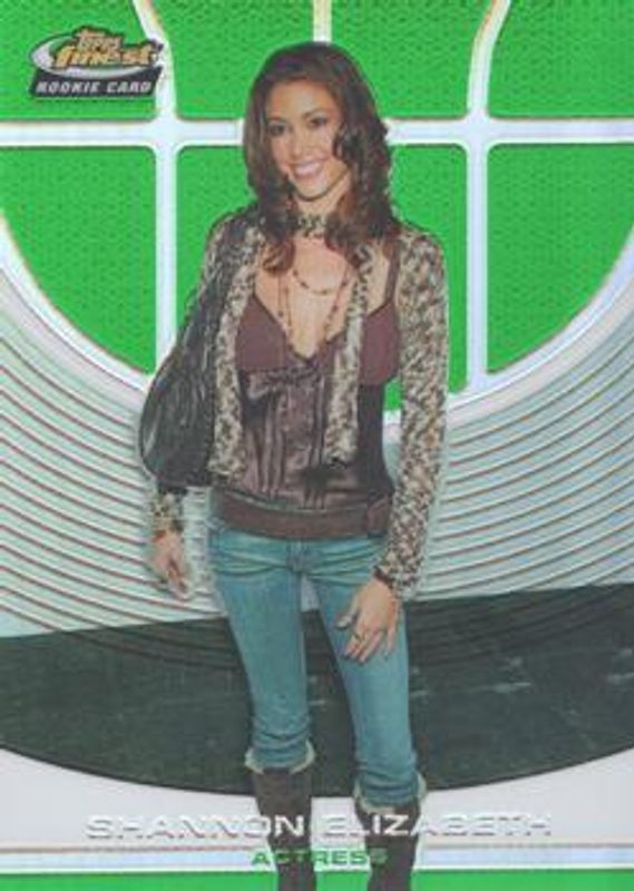 The Shannon Elizabeth 2005 Topps Finest #102 Refractor Green /89 Rookie card is 1 of 33 Shannon Elizabeth's card variations in the 2005 Topps Finest set being tracked by Sports Card Investor, including Base /599, Refractor /249, X Fractors /199, Refractor Red /169, and X Fractors Red /139.