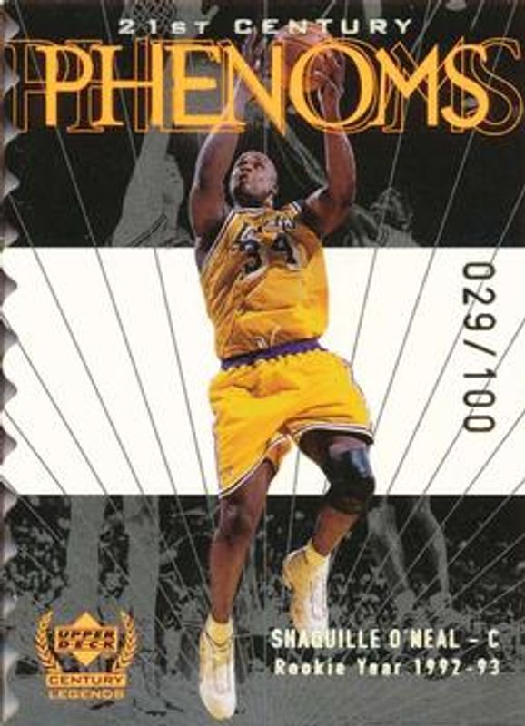 The Shaquille O'Neal 1998 Upper Deck Century Legends #66 Century Collection /100 card is 1 of 5 Shaquille O'Neal's card variations in the 1998 Upper Deck Century Legends set being tracked by Sports Card Investor, including #48 Base, #66 Base, #48 Century Collection /100, and #SO Jerseys of the Century /6.