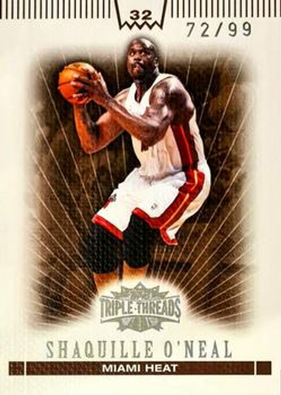 The Shaquille O'Neal 2007 Topps Triple Threads #32 Sepia /99 card is 1 of 40 Shaquille O'Neal's card variations in the 2007 Topps Triple Threads set being tracked by Sports Card Investor, including Base /99, Emerald /33, Gold /3, Platinum /1, and Press Plates Black /1.