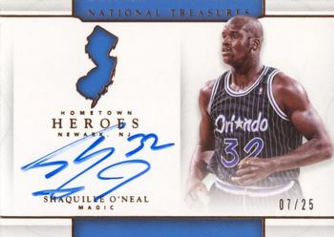 The Shaquille O'Neal 2016 National Treasures #34 Hometown Heroes - Bronze /25 card is 1 of 65 Shaquille O'Neal's card variations in the 2016 National Treasures set being tracked by Sports Card Investor, including Logoman Autographs Printing Plates Black /1, Logoman Autographs Printing Plates Cyan /1, Logoman Autographs Printing Plates Magenta /1, Logoman Autographs Printing Plates Yellow /1, and Retro - Materials /99.