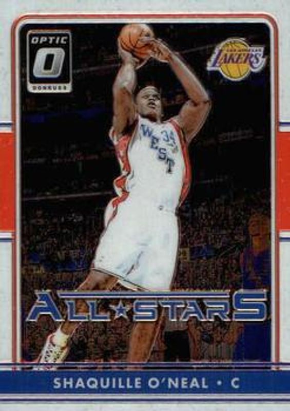 The Shaquille O'Neal 2016 Optic #4 All Stars card is 1 of 28 Shaquille O'Neal's card variations in the 2016 Optic set being tracked by Sports Card Investor, including All Stars - Holo, Hall Kings, Hall Kings - Holo, Hall Kings - Purple, and The Champ is Here.