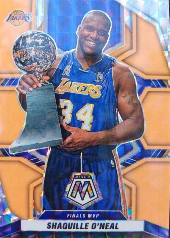 The Shaquille O'Neal 2021 Mosaic #297 Finals MVPs - Orange Fluorescent /25 card in Raw condition has not changed in price in the last 30 days and was last sold for $110.00 .