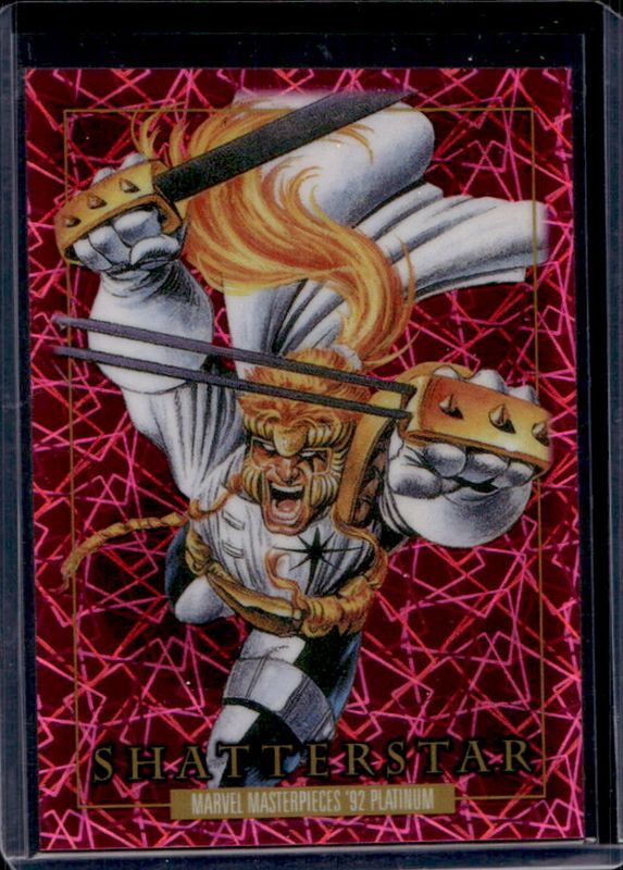 The Shatterstar 2024 Upper Deck Marvel Masterpieces '92 Platinum #74 Pink Laser /992 card is 1 of 38 Shatterstar's card variations in the 2024 Upper Deck Marvel Masterpieces '92 Platinum set being tracked by Sports Card Investor, including Base, Blue Traxx, Canvas, Clear Cut, and Emerald Surge.