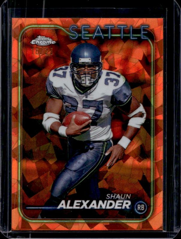 The Shaun Alexander 2024 Topps Chrome Sapphire Edition #183 Orange /25 card is 1 of 12 Shaun Alexander's card variations in the 2024 Topps Chrome Sapphire Edition set being tracked by Sports Card Investor, including Base, Gold /50, White /15, Purple /10, and Red /5.
