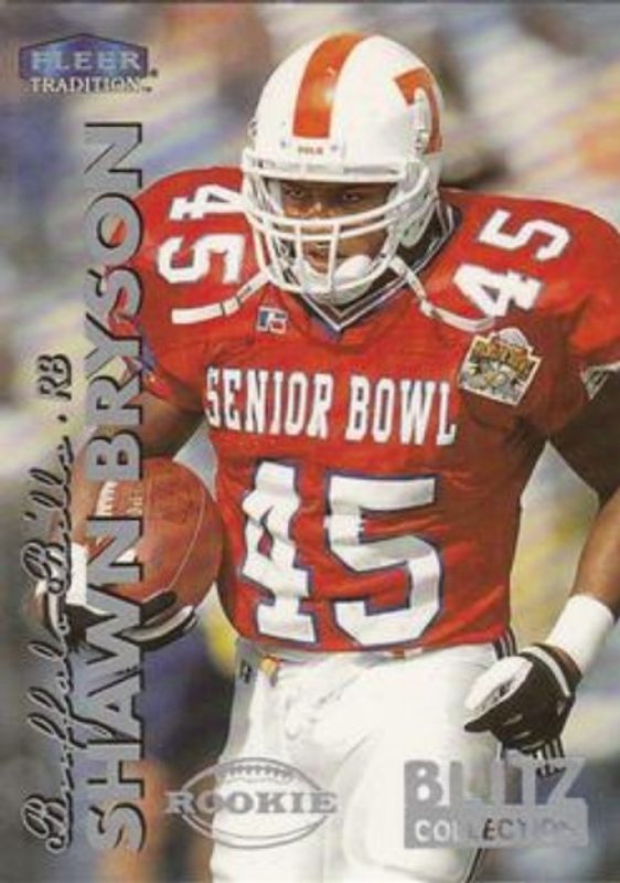 The Shawn Bryson 1999 Fleer Tradition #258BC Blitz Collection Rookie card is 1 of 3 Shawn Bryson's card variations in the 1999 Fleer Tradition set being tracked by Sports Card Investor, including Base, and Trophy Collection /20.