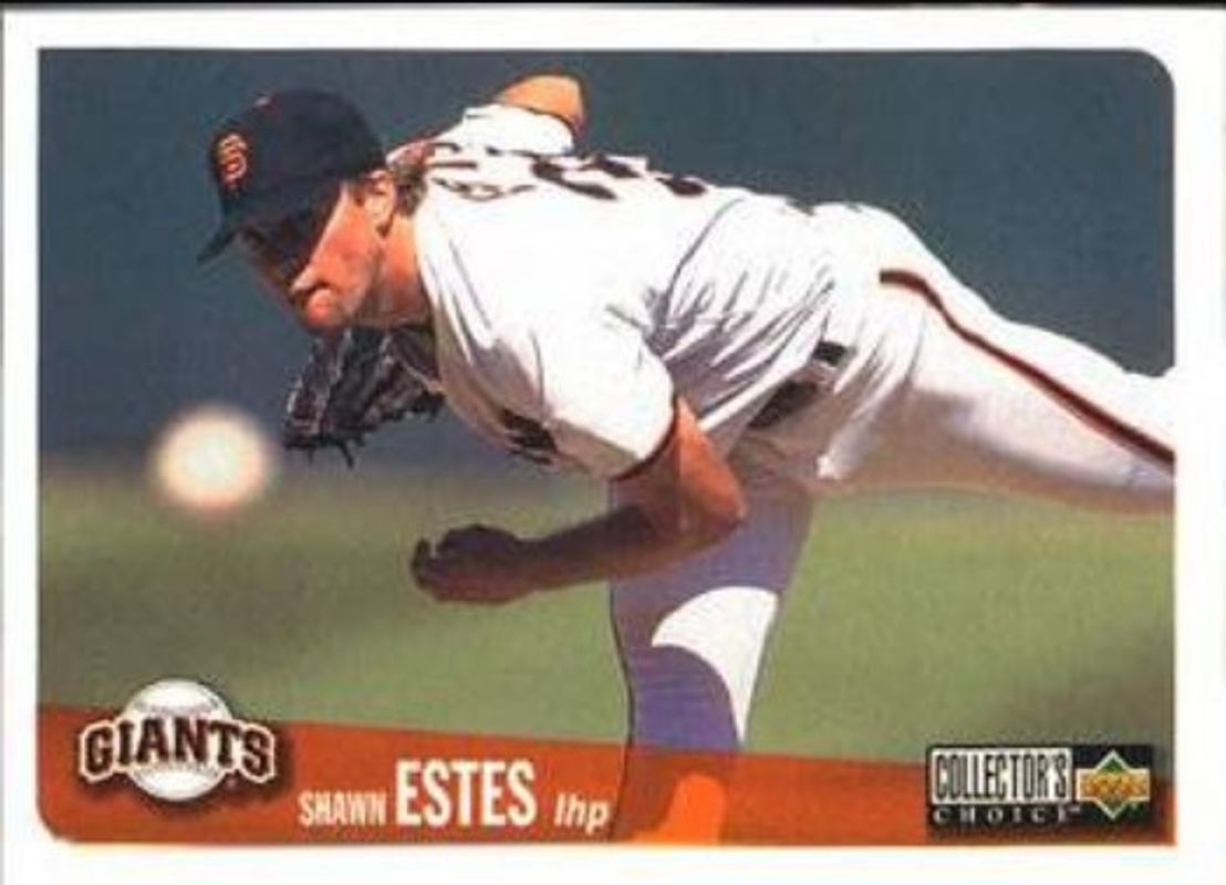 The Shawn Estes 1996 Upper Deck Collector's Choice #722 Base card is 1 of 3 Shawn Estes' card variations in the 1996 Upper Deck Collector's Choice set being tracked by Sports Card Investor, including Gold Signatures, and Silver Signatures.