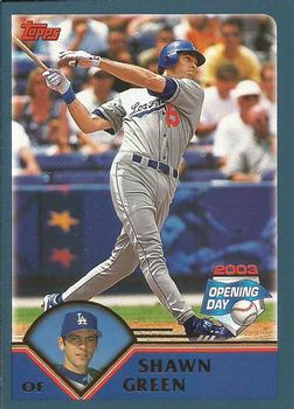 The Shawn Green 2003 Topps Opening Day #100 Base card is 1 of 3 Shawn Green's card variations in the 2003 Topps Opening Day set being tracked by Sports Card Investor, including Base, and Mini Stickers.