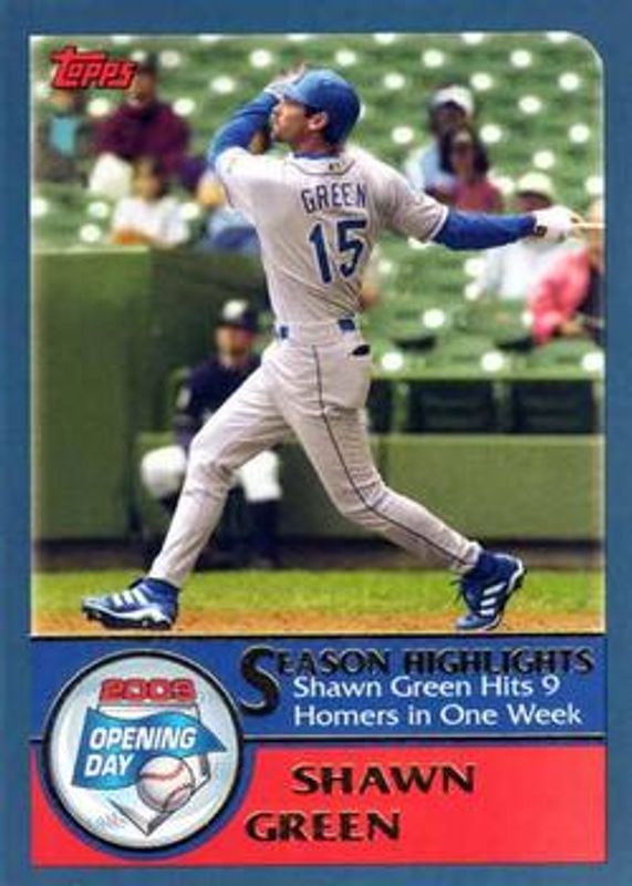 The Shawn Green 2003 Topps Opening Day #161 Base card is 1 of 3 Shawn Green's card variations in the 2003 Topps Opening Day set being tracked by Sports Card Investor, including Base, and Mini Stickers.