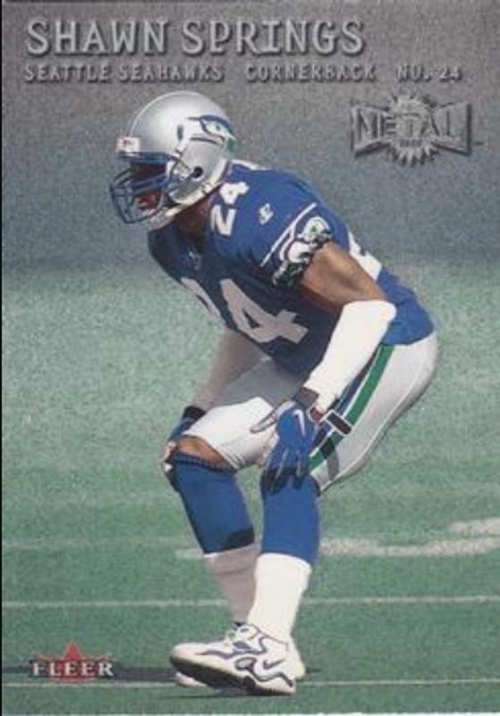 The Shawn Springs 2000 Metal #35 Base card is 1 of 2 Shawn Springs' card variations in the 2000 Metal set being tracked by Sports Card Investor, including Emerald.