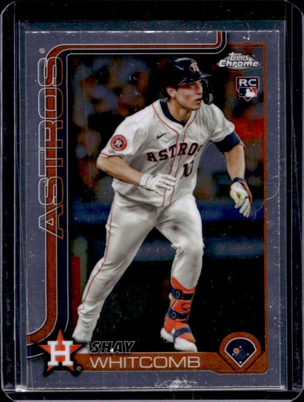 The Shay Whitcomb 2025 Topps Chrome #251 Base Rookie card is 1 of 79 Shay Whitcomb's card variations in the 2025 Topps Chrome set being tracked by Sports Card Investor, including Geometric Refractor, Lightboard Logo Variation, Negative Refractor, Prism Refractor, and RayWave Refractor.