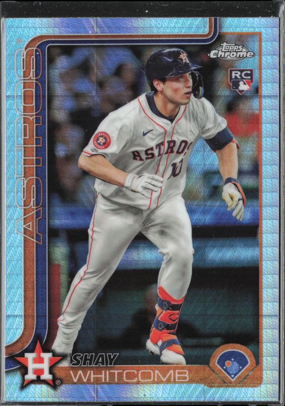 The Shay Whitcomb 2025 Topps Chrome #251 Prism Refractor Rookie card is 1 of 79 Shay Whitcomb's card variations in the 2025 Topps Chrome set being tracked by Sports Card Investor, including Base, Geometric Refractor, Lightboard Logo Variation, Negative Refractor, and RayWave Refractor.