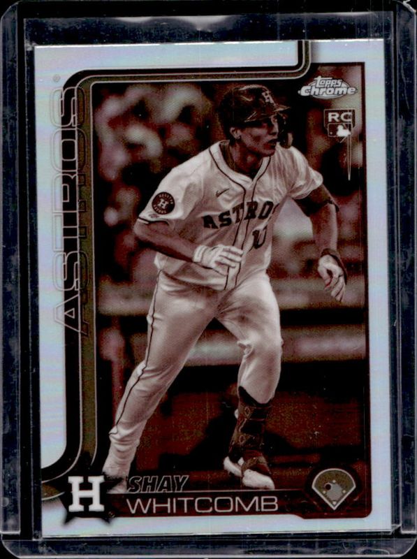 The Shay Whitcomb 2025 Topps Chrome #251 Sepia Refractor Rookie card is 1 of 79 Shay Whitcomb's card variations in the 2025 Topps Chrome set being tracked by Sports Card Investor, including Base, Geometric Refractor, Lightboard Logo Variation, Negative Refractor, and Prism Refractor.