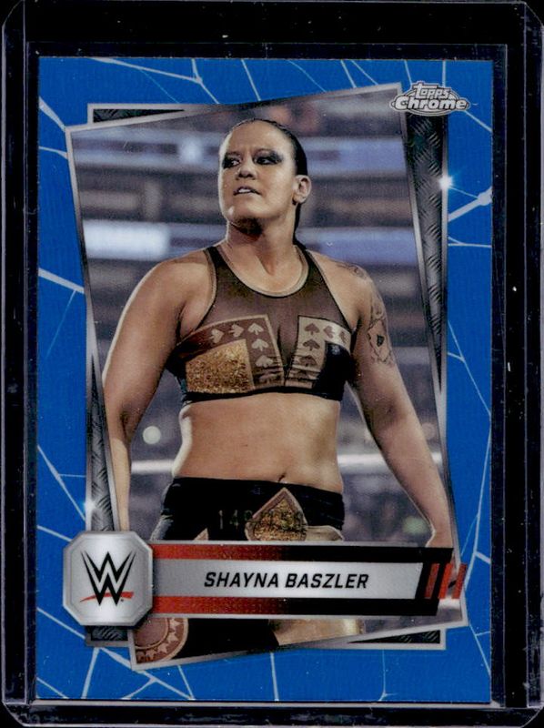 The Shayna Baszler 2025 Topps Chrome WWE #89 Blue Refractor /150 card is 1 of 61 Shayna Baszler's card variations in the 2025 Topps Chrome WWE set being tracked by Sports Card Investor, including Base, Black & Gold Refractor, Geometric Refractor, Neon Green & Black Refractor, and Pink Shimmer Refractor.