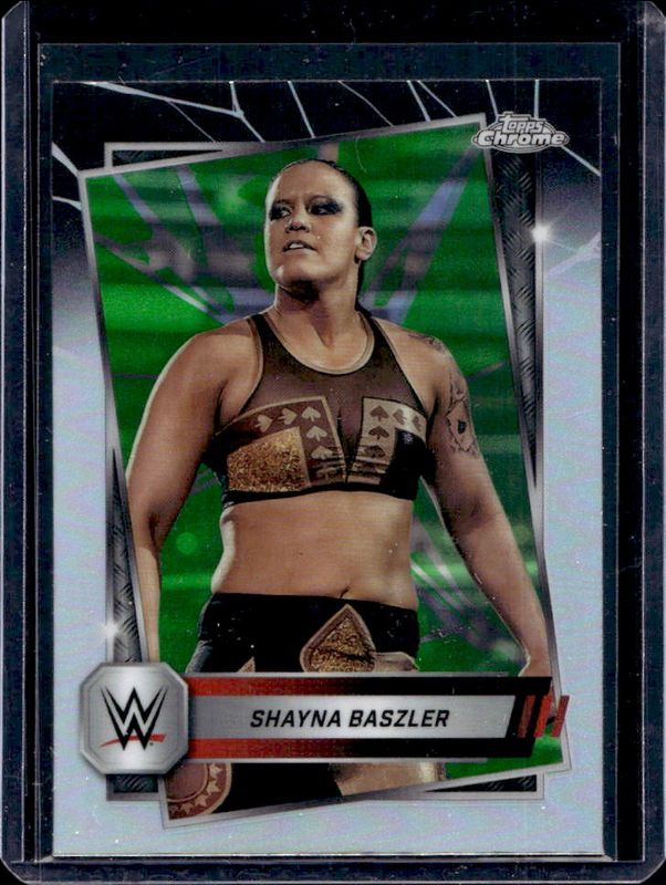 The Shayna Baszler 2025 Topps Chrome WWE #89 Neon Green & Black Refractor card is 1 of 61 Shayna Baszler's card variations in the 2025 Topps Chrome WWE set being tracked by Sports Card Investor, including Base, Black & Gold Refractor, Geometric Refractor, Pink Shimmer Refractor, and Prism Refractor.