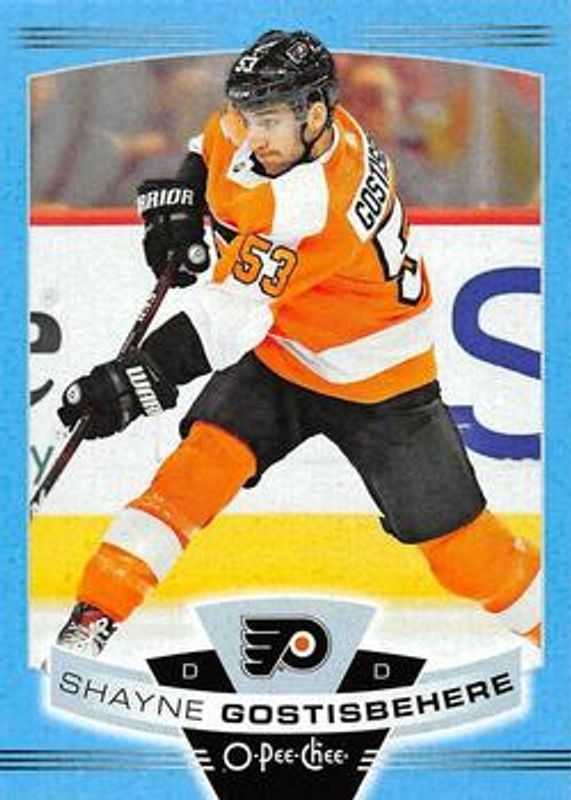 The Shayne Gostisbehere 2019 O-Pee-Chee #357 Blue Border card is 1 of 8 Shayne Gostisbehere's card variations in the 2019 O-Pee-Chee set being tracked by Sports Card Investor, including Base, Gold Border, Red Border, Red Border Blank Back, and Retro.