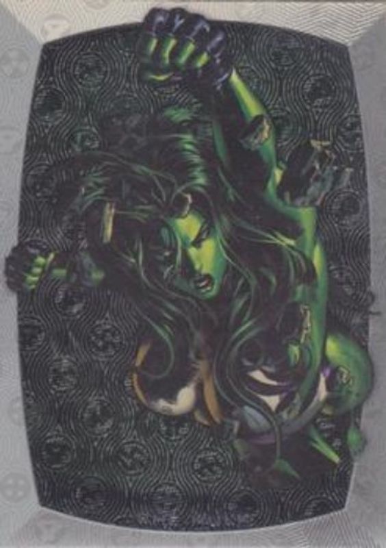 The She-Hulk 2011 Upper Deck Marvel Beginnings Series 1 #M-48 Marvel Prime Micromotion Foil card is 1 of 6 She-Hulk's card variations in the 2011 Upper Deck Marvel Beginnings Series 1 set being tracked by Sports Card Investor, including Base, Printing Plates Black /1, Printing Plates Cyan /1, Printing Plates Magenta /1, and Printing Plates Yellow /1.