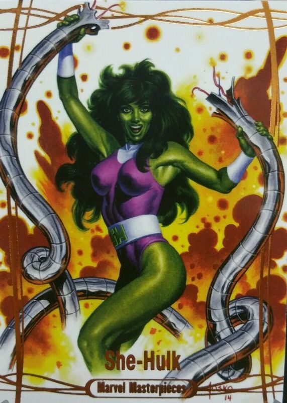 This card is 1 of 3 She-Hulk's card variations in the 2016 Upper Deck Marvel Masterpieces set being tracked by Sports Card Investor, including Base (/999), and Epic Purple Foil /199.