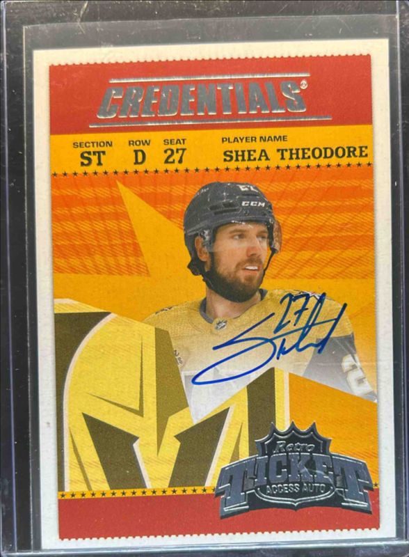 The Shea Theodore 2024 Upper Deck Credentials #RTA-ST Retro Ticket Access Auto card is 1 of 2 Shea Theodore's card variations in the 2024 Upper Deck Credentials set being tracked by Sports Card Investor, including Retro Ticket Access Auto - Gold /5.
