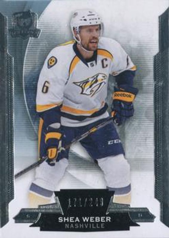 The Shea Weber 2014 Upper Deck The Cup #53 Base /249 card is 1 of 31 Shea Weber's card variations in the 2014 Upper Deck The Cup set being tracked by Sports Card Investor, including Artist Proof Foundation Patch, Artist Proof Honorable Numbers, Artist Proof Limited Logos, Gold Spectrum Autographs /25, and Gold /10.