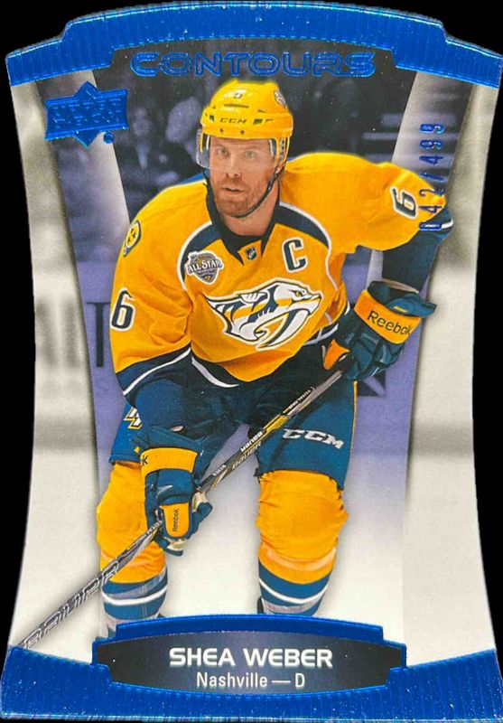 The Shea Weber 2015 Upper Deck Contours #64 Blue /499 card is 1 of 8 Shea Weber's card variations in the 2015 Upper Deck Contours set being tracked by Sports Card Investor, including Base /499, Red /99, Gold /10, Printing Plates Black /1, and Printing Plates Cyan /1.