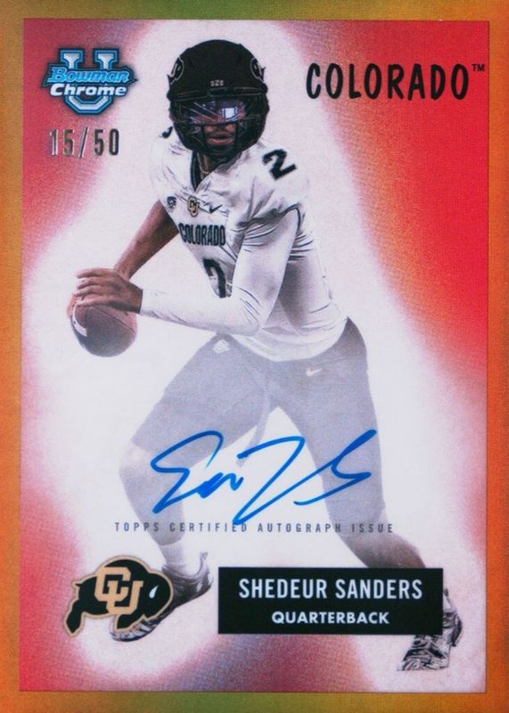 Best Prices Available For Sale of Shedeur Sanders 2023 Bowman Chrome University #55B-SSA 1955 Bowman Football Autographs - Gold Refractor /50