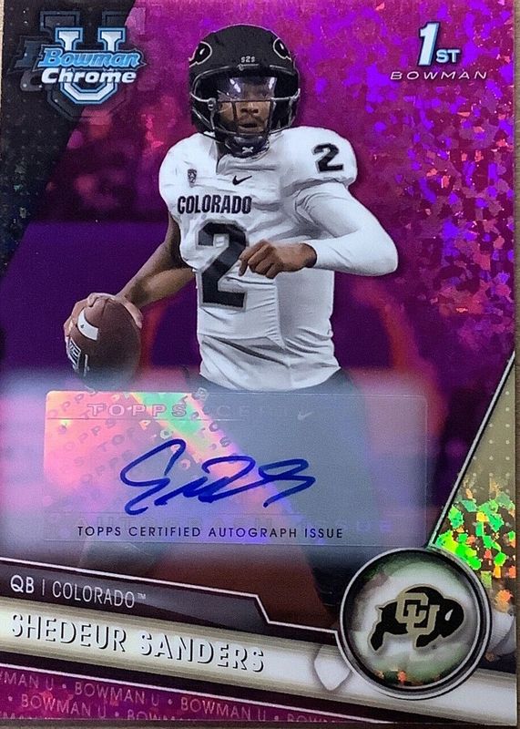 Auctions Ending Soon for Shedeur Sanders 2023 Bowman Chrome University #16 Prospect Auto - Fuchsia Mini-Diamond Refractor /150 (1st) RAW