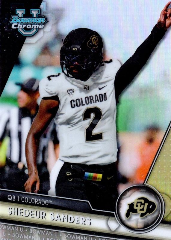 The Shedeur Sanders 2023 Bowman Chrome University #88 Prospects - SP Variation card in Raw condition has moved up $5.00 (+50.0%) in the last 30 days and was last sold for $15.00 .