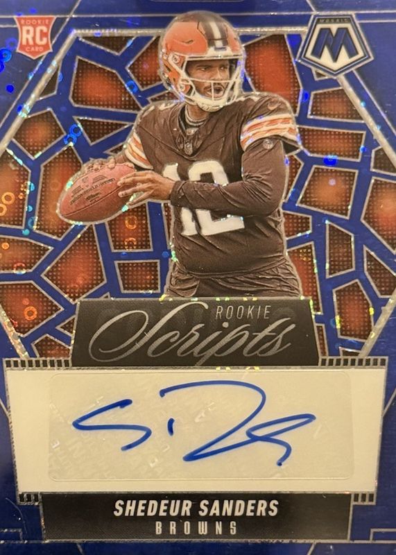 The Shedeur Sanders 2025 Mosaic #RS-SSS Rookie Scripts - No Huddle Blue card in Raw condition has moved up $0.51 (+0.4%) in the last 30 days and was last sold for $140.00 .