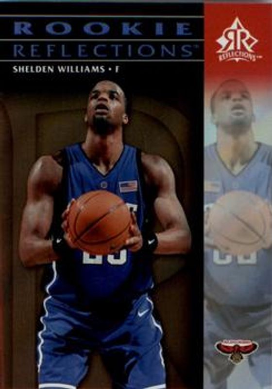 The Shelden Williams 2006 Upper Deck Reflections #110 Blue /49 Rookie card is 1 of 9 Shelden Williams' card variations in the 2006 Upper Deck Reflections set being tracked by Sports Card Investor, including Base /150, Gold /299, Copper /99, Black /1, and Signatures Reflections - Silver.