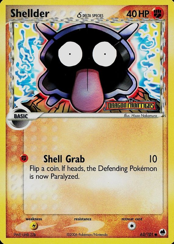 The Shellder 2006 EX: Dragon Frontiers #063/101 Reverse Holo card in Raw TCG (Near Mint) condition has moved down -$0.84 (-7.8%) in the last 30 days and was last sold for $9.95 .