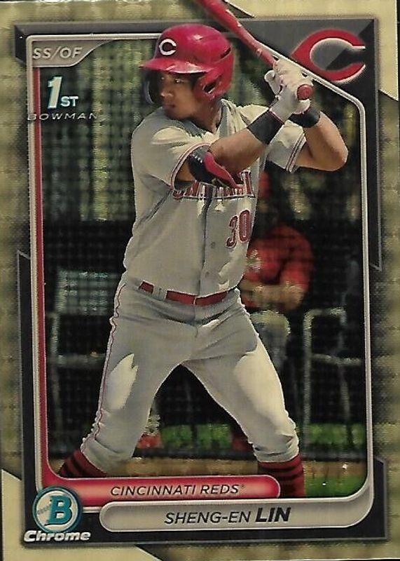 This card is 1 of 51 Sheng-En Lin's card variations in the 2024 Bowman Chrome set being tracked by Sports Card Investor, including Prospects (1st), Prospects - Shimmer Refractor (1st), Prospects - Refractor /499 (1st), Prospects - Speckle Refractor /299 (1st), and Prospects - Purple Refractor /250 (1st).