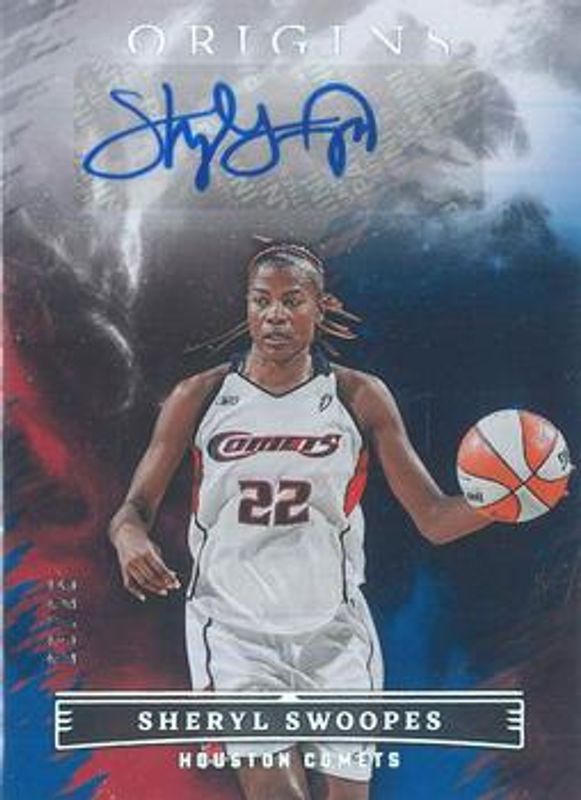 The Sheryl Swoopes 2023 Origins WNBA #OA-SWP Origins Autographs - Blue /25 card is 1 of 32 Sheryl Swoopes' card variations in the 2023 Origins WNBA set being tracked by Sports Card Investor, including Base, Rainbow, Red, Blue /75, and Teal /35.