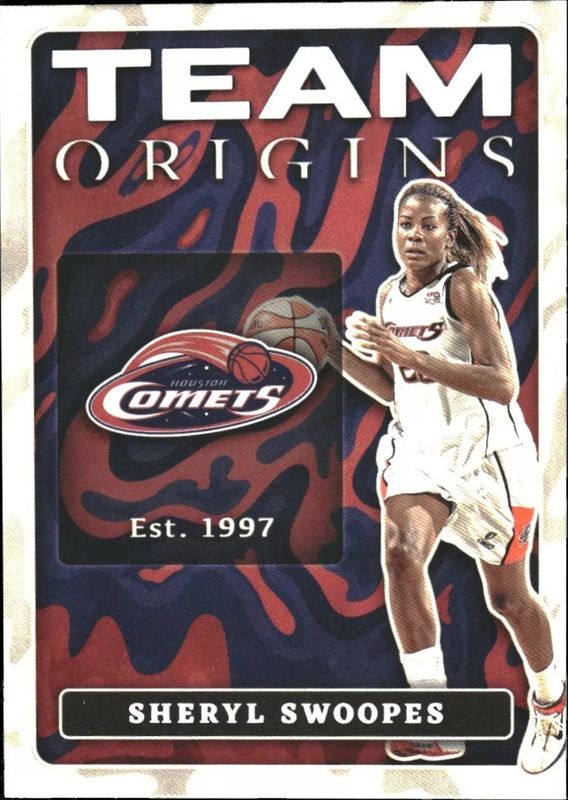 The Sheryl Swoopes 2023 Origins WNBA #4 Team Origins card is 1 of 32 Sheryl Swoopes' card variations in the 2023 Origins WNBA set being tracked by Sports Card Investor, including Base, Rainbow, Red, Blue /75, and Teal /35.