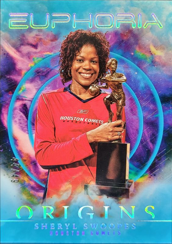The Sheryl Swoopes 2024 Origins WNBA #5 Euphoria - Teal /49 card is 1 of 26 Sheryl Swoopes' card variations in the 2024 Origins WNBA set being tracked by Sports Card Investor, including Base, Red /99, Blue /75, Swirl /(SSP), and Teal /49.