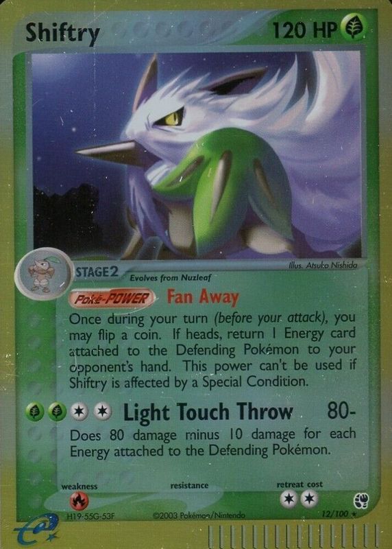 The Shiftry 2003 EX: Sandstorm #012/100 Reverse Holo card in Raw TCG (Near Mint) condition has not changed in price in the last 30 days and was last sold for $4.00 .