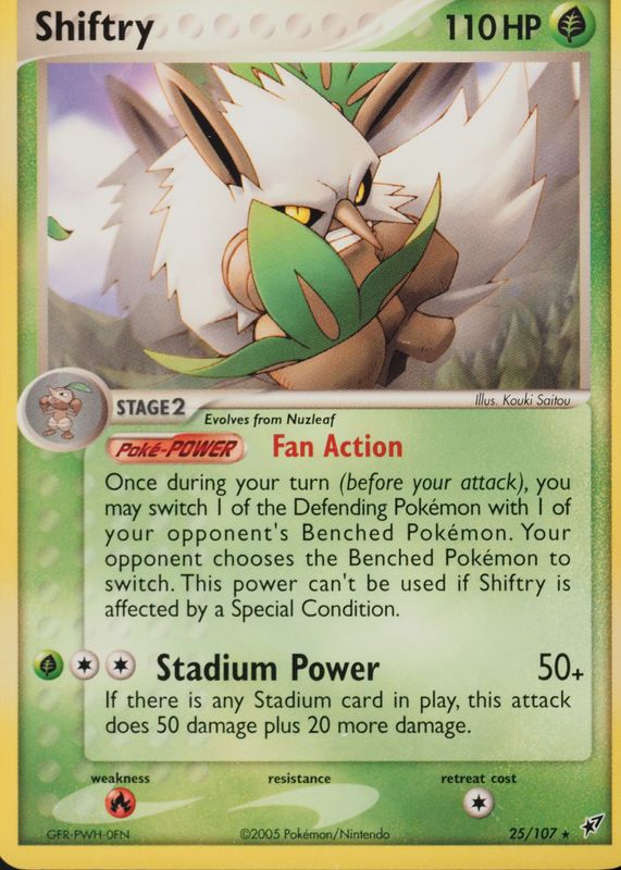 The Shiftry 2005 EX: Deoxys #025/107 Base card in Raw TCG (Near Mint) condition has not changed in price in the last 30 days and was last sold for $10.60 .