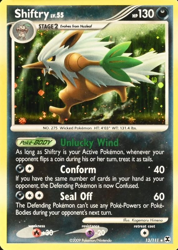 The Shiftry 2009 Platinum: Rising Rivals #013/111 Holo card in Raw TCG (Near Mint) condition has not changed in price in the last 30 days and was last sold for $4.41 .