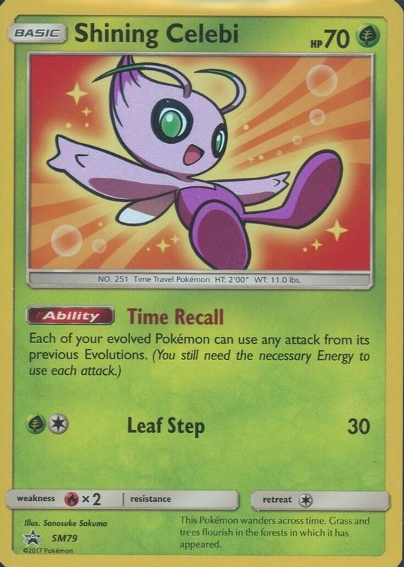 The Shining Celebi 2017 Sun & Moon: Black Star Promo #SM79 Super-Premium Collection (Shining Legends) card in Raw TCG (Near Mint) condition has moved down -$13.33 (-40.0%) in the last 30 days and was last sold for $20.00 .