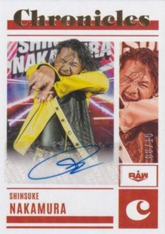 The Shinsuke Nakamura 2023 Chronicles WWE #CS-SNK Chronicles Signatures - Gold /10 card is 1 of 22 Shinsuke Nakamura's card variations in the 2023 Chronicles WWE set being tracked by Sports Card Investor, including Base, Bronze, Pink /199, Red /199, and Blue /99.