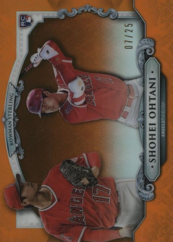 The Shohei Ohtani 2018 Bowman Chrome #BS-SO Bowman Sterling Continuity - Orange Refractor /25 Rookie card in Raw condition has not changed in price in the last 30 days and was last sold for $3,412.80 .