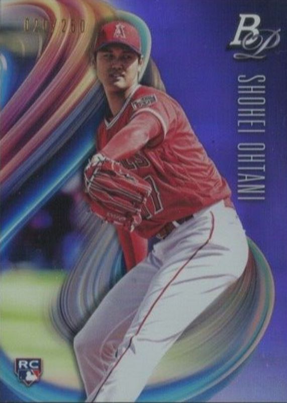 The Shohei Ohtani 2018 Bowman Platinum #34 Purple /250 (With Glove) Rookie card in Raw condition has not changed in price in the last 30 days and was last sold for $440.00 .