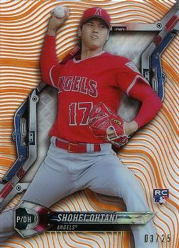 The Shohei Ohtani 2018 Topps High Tek #HT-SO Orange Galactic Diffractor /25 Rookie card is 1 of 51 Shohei Ohtani's card variations in the 2018 Topps High Tek set being tracked by Sports Card Investor, including Base, Pattern 1, Galactic Diffractor, Magma Diffractor, and Orbit Diffractor.