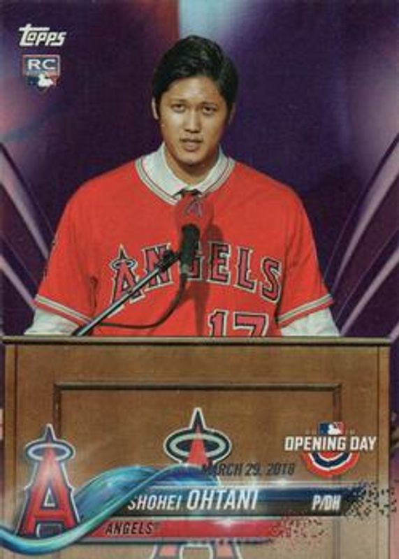 The Shohei Ohtani 2018 Topps Opening Day #200 Purple Rookie card is 1 of 10 Shohei Ohtani's card variations in the 2018 Topps Opening Day set being tracked by Sports Card Investor, including Base, Opening Day Edition Blue Foil, 5x7 /49, 5x7 Gold /10, and Opening Day 1 of 1 /1.