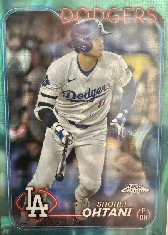 The Shohei Ohtani 2024 Topps Chrome #1 Aqua RayWave Refractor /199 card in Raw condition has not changed in price in the last 30 days and was last sold for $130.00 .