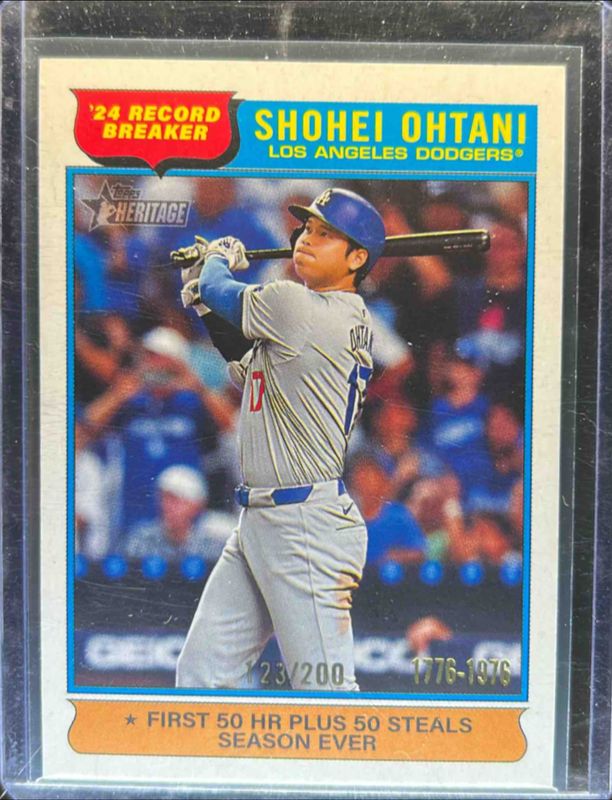 The Shohei Ohtani 2025 Topps Heritage #1 Bicentennial /200 card is 1 of 71 Shohei Ohtani's card variations in the 2025 Topps Heritage set being tracked by Sports Card Investor, including #1 Base, #193 Base, #148 Base, #148 Alternate Cartoon Variation, and #193 Black Border.